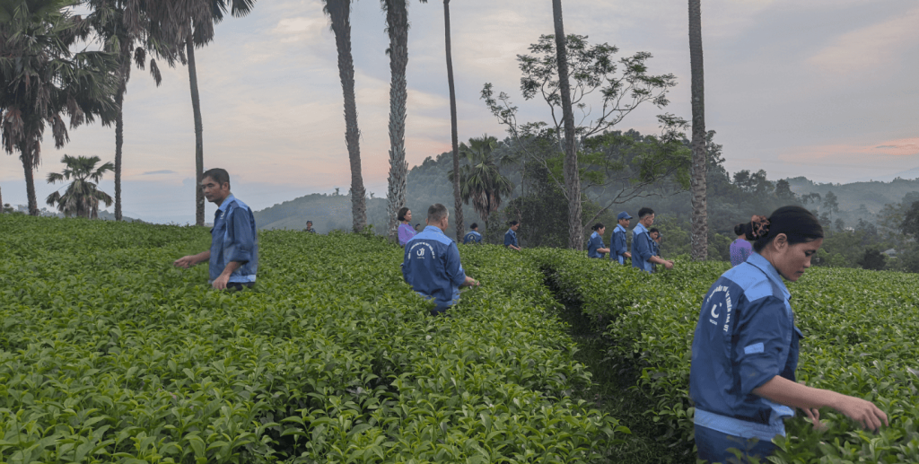 Một điểm đặc biệt dễ nhận thấy trong khung cảnh đồi chè xuân 2026 chính là sự đồng bộ và chuyên nghiệp trong cách tổ chức sản xuất. Đội ngũ lao động được trang bị đầy đủ, làm việc theo quy trình rõ ràng, thể hiện sự đầu tư bài bản và định hướng phát triển lâu dài. Điều này không chỉ nâng cao năng suất mà còn góp phần khẳng định uy tín của đơn vị sản xuất trên thị trường.
